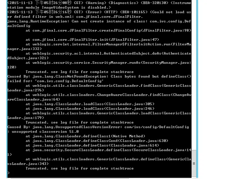 用jfinal开发的项目,无论在tomcat下还是在直接运行,都没有报错。唯独在weblogic下时出现无法实例化配置类的问题。
