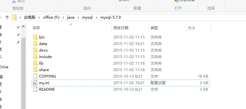 首先解压到F:\java\mysql\mysql-5.7.9目录下,如图: