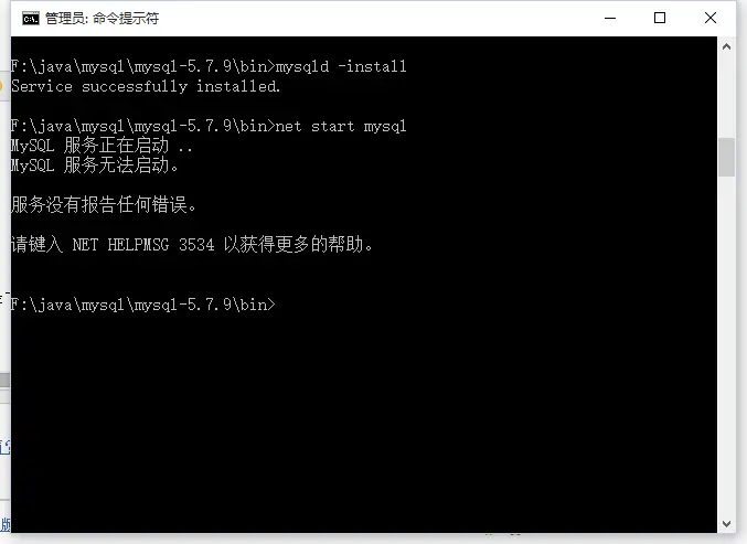 然后,运行-> cmd(管理员权限) -> cd F:\java\mysql\mysql-5.7.9\bin目录下,执行如下命令,出现如下报错: