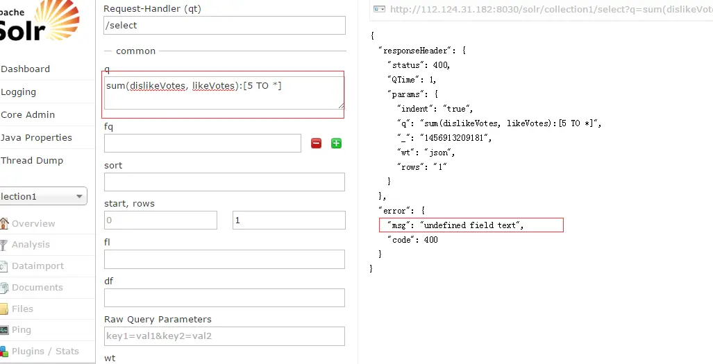 找到答案了q={!func}<spanstyle="font-size:13.3333330154419px;">sum(likeVotes,dislikeVotes),fq={!frangel=5}totalVotes,其中<spanstyle="font-size:13.3333330154419px;">sum(likeVotes,dislikeVotes)代表和, frangel=5代表相加的结果大于等于5