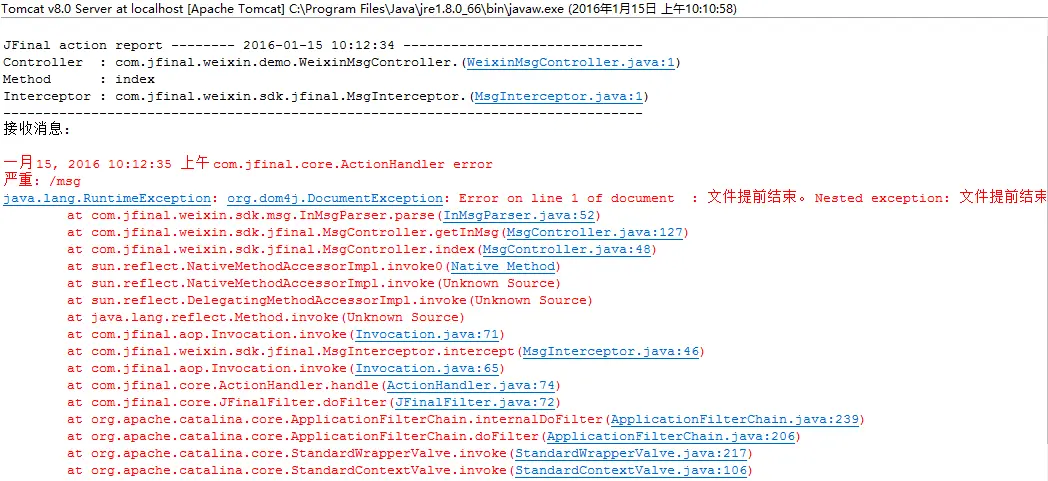 使用Tomcat8运行JfinalWeixin,访问/msg时报错,项目导入了jfinal_weixin.jar、jfinal.jar、demo4j.jar,报错信息如下,求大神解决,在线急等!!!!