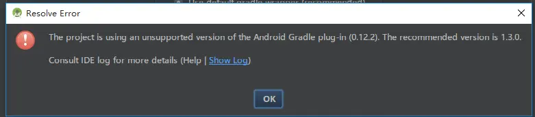 20:32:12,167 [7045564] INFO - .project.GradleProjectResolver - Gradle project resolve error java.lang.IllegalStateException: The project is using an unsupported version of the Android Gradle plug-in (0.12.2). The recommended version is 1.3.0. at com.android.tools.idea.gradle.project.AndroidGradleProjectResolver.createModule(AndroidGradleProjectResolver.java:115) at org.jetbrains.plugins.gradle.service.project.AbstractProjectResolverExtension.createModule(AbstractProjectResolverExtension.java:92) at org.jetbrains.plugins.gradle.service.project.GradleProjectResolver.doResolveProjectInfo(GradleProjectResolver.java:250) at org.jetbrains.plugins.gradle.service.project.GradleProjectResolver.access$300(GradleProjectResolver.java:65) at org.jetbrains.plugins.gradle.service.project.GradleProjectResolver$ProjectConnectionDataNodeFunction.fun(GradleProjectResolver.java:360) at org.jetbrains.plugins.gradle.service.project.GradleProjectResolver$ProjectConnectionDataNodeFunction.fun(GradleProjectResolver.java:332) at org.jetbrains.plugins.gradle.service.project.GradleExecutionHelper.execute(GradleExecutionHelper.java:225) at org.jetbrains.plugins.gradle.service.project.GradleProjectResolver.resolveProjectInfo(GradleProjectResolver.java:97) at org.jetbrains.plugins.gradle.service.project.GradleProjectResolver.resolveProjectInfo(GradleProjectResolver.java:65) at com.intellij.openapi.externalSystem.service.remote.RemoteExternalSystemProjectResolverImpl$1.produce(RemoteExternalSystemProjectResolverImpl.java:41) at com.intellij.openapi.externalSystem.service.remote.RemoteExternalSystemProjectResolverImpl$1.produce(RemoteExternalSystemProjectResolverImpl.java:37) at com.intellij.openapi.externalSystem.service.remote.AbstractRemoteExternalSystemService.execute(AbstractRemoteExternalSystemService.java:59) at com.intellij.openapi.externalSystem.service.remote.RemoteExternalSystemProjectResolverImpl.resolveProjectInfo(RemoteExternalSystemProjectResolverImpl.java:37) at com.intellij.openapi.externalSystem.service.remote.wrapper.ExternalSystemProjectResolverWrapper.resolveProjectInfo(ExternalSystemProjectResolverWrapper.java:49) at com.intellij.openapi.externalSystem.service.internal.ExternalSystemResolveProjectTask.doExecute(ExternalSystemResolveProjectTask.java:51) at com.intellij.openapi.externalSystem.service.internal.AbstractExternalSystemTask.execute(AbstractExternalSystemTask.java:138) at com.intellij.openapi.externalSystem.service.internal.AbstractExternalSystemTask.execute(AbstractExternalSystemTask.java:124) at com.intellij.openapi.externalSystem.util.ExternalSystemUtil$4.execute(ExternalSystemUtil.java:540) at com.intellij.openapi.externalSystem.util.ExternalSystemUtil$5$1.run(ExternalSystemUtil.java:612) at com.intellij.openapi.progress.impl.CoreProgressManager$TaskRunnable.run(CoreProgressManager.java:563) at com.intellij.openapi.progress.impl.CoreProgressManager$8.run(CoreProgressManager.java:367) at com.intellij.openapi.progress.impl.CoreProgressManager$2.run(CoreProgressManager.java:152) at com.intellij.openapi.progress.impl.CoreProgressManager.registerIndicatorAndRun(CoreProgressManager.java:452) at com.intellij.openapi.progress.impl.CoreProgressManager.executeProcessUnderProgress(CoreProgressManager.java:402) at com.intellij.openapi.progress.impl.ProgressManagerImpl.executeProcessUnderProgress(ProgressManagerImpl.java:54) at com.intellij.openapi.progress.impl.CoreProgressManager.runProcess(CoreProgressManager.java:137) at com.intellij.openapi.application.impl.ApplicationImpl$10$1.run(ApplicationImpl.java:617) at com.intellij.openapi.application.impl.ApplicationImpl$8.run(ApplicationImpl.java:400) at java.util.concurrent.Executors$RunnableAdapter.call(Executors.java:511) at java.util.concurrent.FutureTask.run(FutureTask.java:266) at java.util.concurrent.ThreadPoolExecutor.runWorker(ThreadPoolExecutor.java:1142) at java.util.concurrent.ThreadPoolExecutor$Worker.run(ThreadPoolExecutor.java:617) at java.lang.Thread.run(Thread.java:745) at org.jetbrains.ide.PooledThreadExecutor$1$1.run(PooledThreadExecutor.java:56) 2015-10-20 20:32:12,183 [7045580] INFO - .BaseProjectImportErrorHandler - Failed to import Gradle project at 'D:/workspace/JamsMusicPlayer' java.lang.IllegalStateException: The project is using an unsupported version of the Android Gradle plug-in (0.12.2). The recommended version is 1.3.0. at com.android.tools.idea.gradle.project.AndroidGradleProjectResolver.createModule(AndroidGradleProjectResolver.java:115) at org.jetbrains.plugins.gradle.service.project.AbstractProjectResolverExtension.createModule(AbstractProjectResolverExtension.java:92) at org.jetbrains.plugins.gradle.service.project.GradleProjectResolver.doResolveProjectInfo(GradleProjectResolver.java:250) at org.jetbrains.plugins.gradle.service.project.GradleProjectResolver.access$300(GradleProjectResolver.java:65) at org.jetbrains.plugins.gradle.service.project.GradleProjectResolver$ProjectConnectionDataNodeFunction.fun(GradleProjectResolver.java:360) at org.jetbrains.plugins.gradle.service.project.GradleProjectResolver$ProjectConnectionDataNodeFunction.fun(GradleProjectResolver.java:332) at org.jetbrains.plugins.gradle.service.project.GradleExecutionHelper.execute(GradleExecutionHelper.java:225) at org.jetbrains.plugins.gradle.service.project.GradleProjectResolver.resolveProjectInfo(GradleProjectResolver.java:97) at org.jetbrains.plugins.gradle.service.project.GradleProjectResolver.resolveProjectInfo(GradleProjectResolver.java:65) at com.intellij.openapi.externalSystem.service.remote.RemoteExternalSystemProjectResolverImpl$1.produce(RemoteExternalSystemProjectResolverImpl.java:41) at com.intellij.openapi.externalSystem.service.remote.RemoteExternalSystemProjectResolverImpl$1.produce(RemoteExternalSystemProjectResolverImpl.java:37) at com.intellij.openapi.externalSystem.service.remote.AbstractRemoteExternalSystemService.execute(AbstractRemoteExternalSystemService.java:59) at com.intellij.openapi.externalSystem.service.remote.Remot
