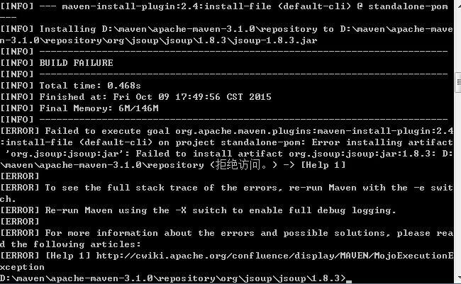 mvn install:install-file -Dfile=D:\maven\apache-maven-3.1.0\repository -DgroupId=org.jsoup -DartifactId=jsoup -Dversion=1.8.3 -Dpackaging=jar