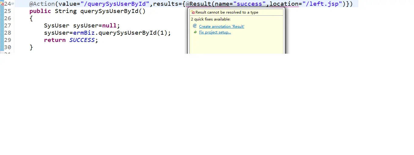 @Action(value="/querySysUserById",results={@Result(name="success",location="/left.jsp")})
