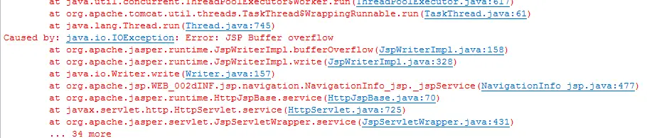 <%@pagecontentType="text/html;charset=UTF-8"autoFlush="false" buffer="800kb"%>增大JSP的缓存,然后再试试增加JVM的堆空间