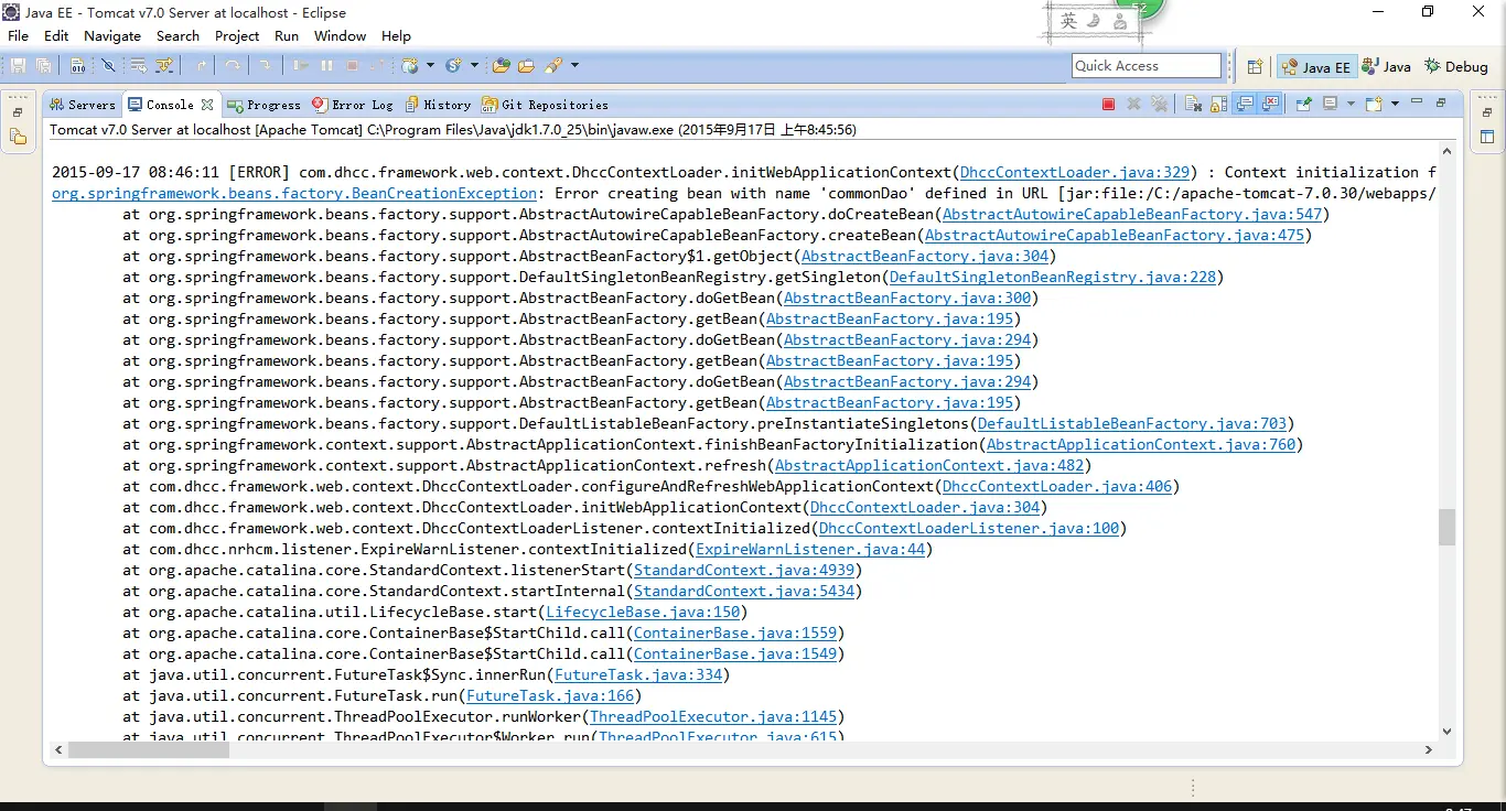 明白!同事在弄spring注入的问题,dao层注入失败~谢谢.OK我在调试很平常的报错spring+hibernate配置有问题