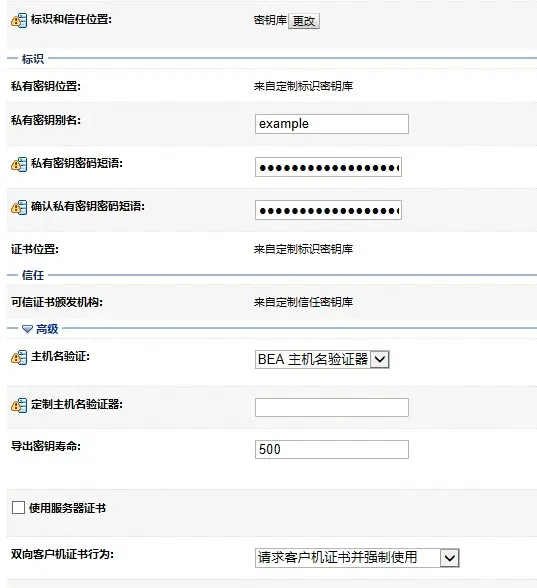 不知道你的证书是怎么制作的。也是按照我那个步骤来的?现在成功了么?用openssl做的,后来也不知道怎么弄得,误打误撞弄出来了一开始证书都是是照着你的做的,但没有成功,后来又找了些资料做出来了(双向认证,自己生成CA)。不过现在只能支持TLS1.0,不知道是不是weblogic版本的问题(我用的是11g)。不过还是谢谢你,如果楼主有空的话,能不能写个详细的介绍SSL自签署双向认证的帖子,网上的资料太少了。
