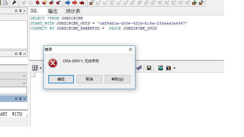 检查下JGBZCPCBK后面除了换行符,有没有别的多余字符,以及STARTWITH中间的空格是不是半角的。还有就是你的表名、字段名等是否正确。