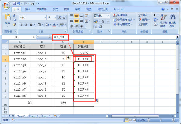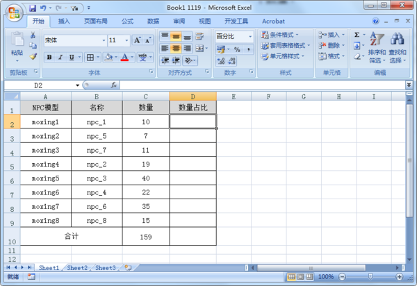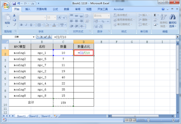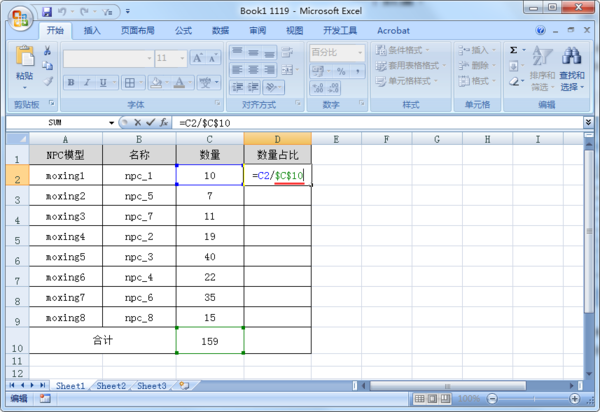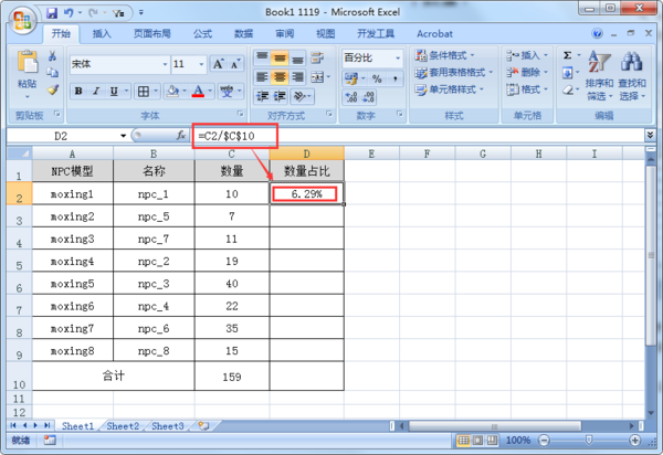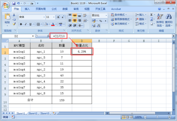 2、在D2单元格输入公式:=C2/C10,计算moxing1的数量占比。