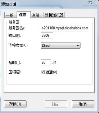 其次,点击“连接”选项卡。在服务器处:填写RDS的数据实例链接名(如example201108.mysql.alibabalabs.com)。 在端口处:3306。