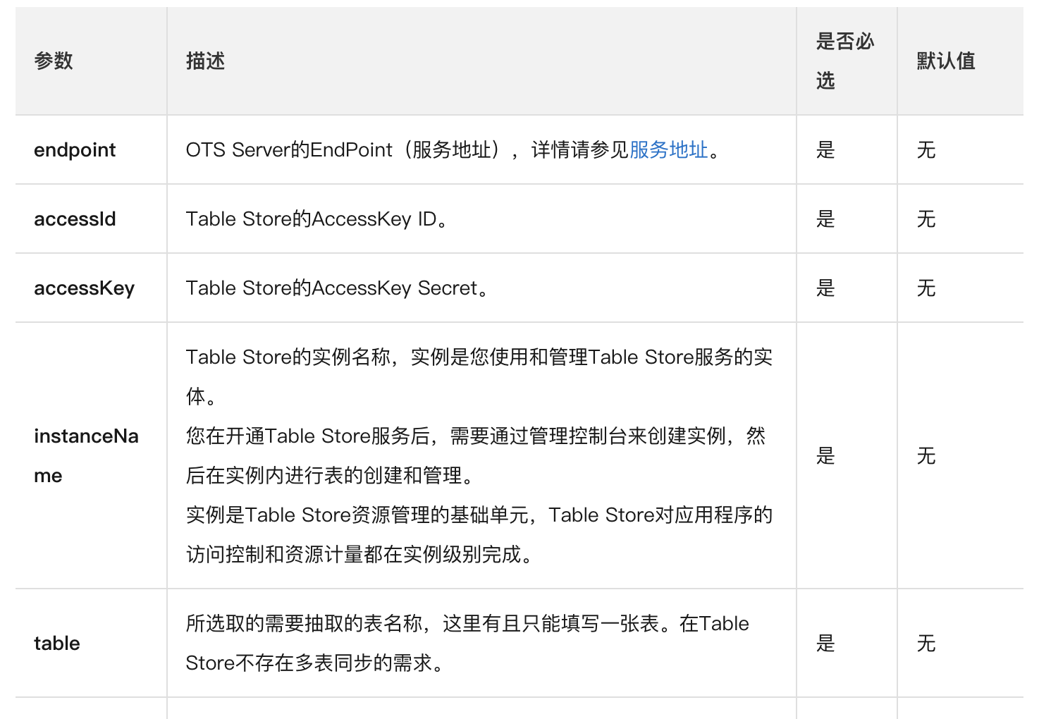 参数 描述 是否必选 默认值 endpoint OTS Server的EndPoint(服务地址),详情请参见服务地址。 是 无 accessId Table Store的AccessKey ID。 是 无 accessKey Table Store的AccessKey Secret。 是 无 instanceName Table Store的实例名称,实例是您使用和管理Table Store服务的实体。 您在开通Table Store服务后,需要通过管理控制台来创建实例,然后在实例内进行表的创建和管理。 实例是Table Store资源管理的基础单元,Table Store对应用程序的访问控制和资源计量都在实例级别完成。 是 无 table 所选取的需要抽取的表名称,这里有且只能填写一张表。在Table Store不存在多表同步的需求。 是 无 column 所配置的表中需要同步的列名集合,使用JSON的数组描述字段信息。由于Table Store本身是NoSQL系统,在OTS Reader抽取数据过程中,必须指定相应的字段名称。 是 无 begin和end begin和end配置项必须配对使用,用于表示抽取Table Store表数据的范围。 是 空 split 该配置项属于高级配置项,是您自己定义切分配置信息,普通情况下不建议使用。 适用场景:通常在Table Store数据存储发生热点,使用OTS Reader自动切分的策略不能生效的情况下,使用您自定义的切分规则。 split指定在Begin、End区间内的切分点,且只能是partitionKey的切分点信息,即在split仅配置partitionKey,而不需要指定全部的PrimaryKey。 否 无 https://help.aliyun.com/document_detail/137729.html ,此回答整理自钉群“DataWorks交流群(答疑@机器人)”