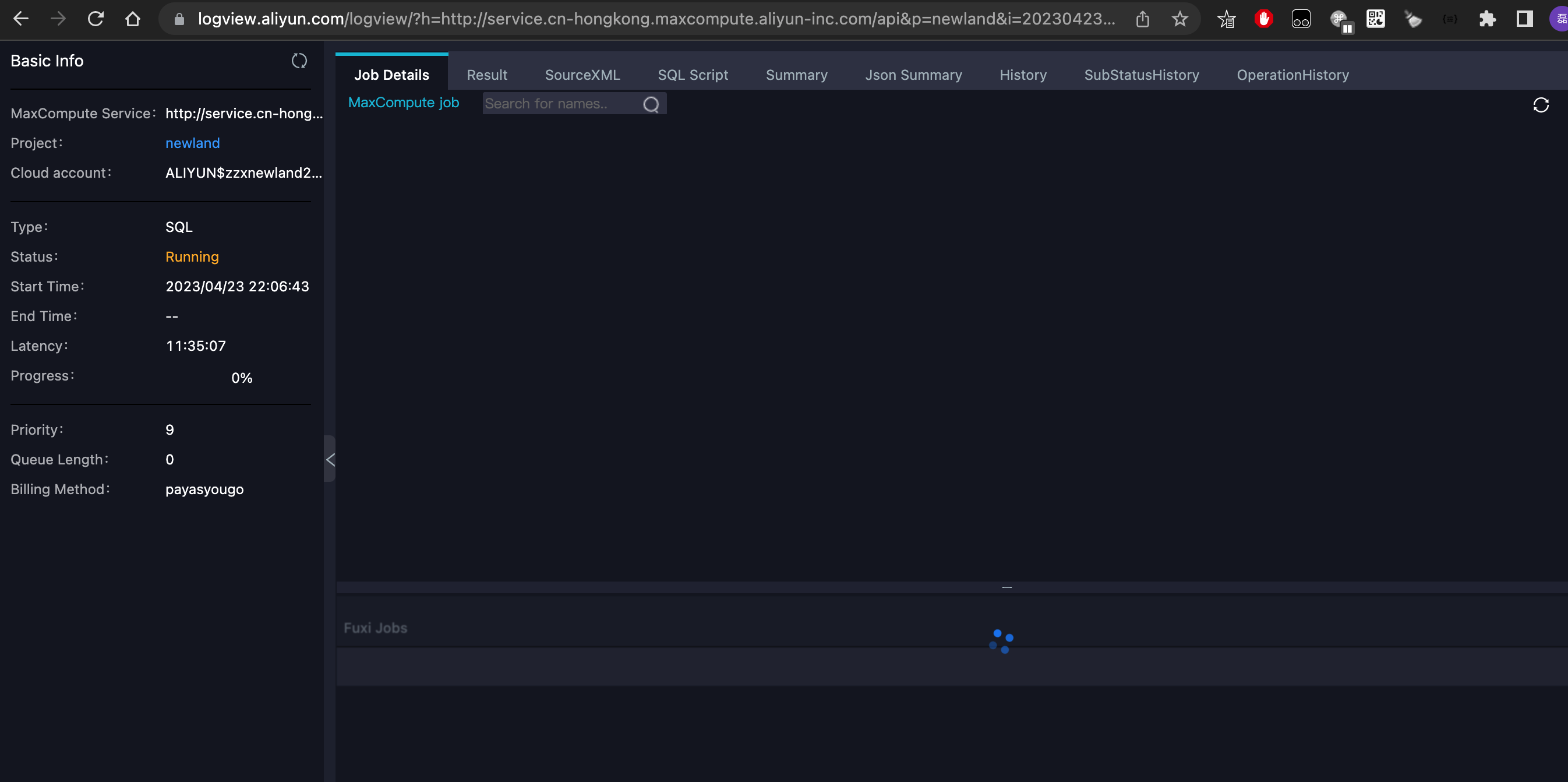 昨天晚上执行的,现在还在转圈圈,MaxCompute是执行失败了吗? https://logview.aliyun.com/logview/?h=http://service.cn-hongkong.maxcompute.aliyun-inc.com/api&p=newland&i=20230423140643179gzg3cs2sjzd5&token=THFnTlhOUkxvRklNbW1ZTSt2Ym9vMnl4bEVFPSxPRFBTX09CTzoxNzczNjIzOTgzNDYwMjQwLDE2ODQ4NTA4MDMseyJTdGF0ZW1lbnQiOlt7IkFjdGlvbiI6WyJvZHBzOlJlYWQiXSwiRWZmZWN0IjoiQWxsb3ciLCJSZXNvdXJjZSI6WyJhY3M6b2RwczoqOnByb2plY3RzL25ld2xhbmQvaW5zdGFuY2VzLzIwMjMwNDIzMTQwNjQzMTc5Z3pnM2NzMnNqemQ1Il19XSwiVmVyc2lvbiI6IjEifQ==