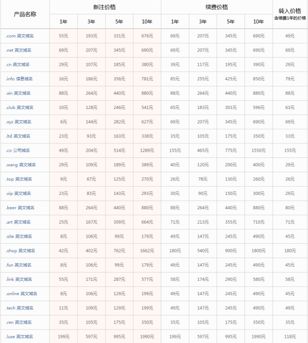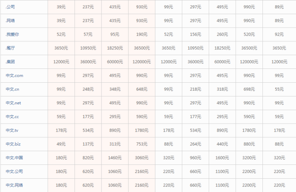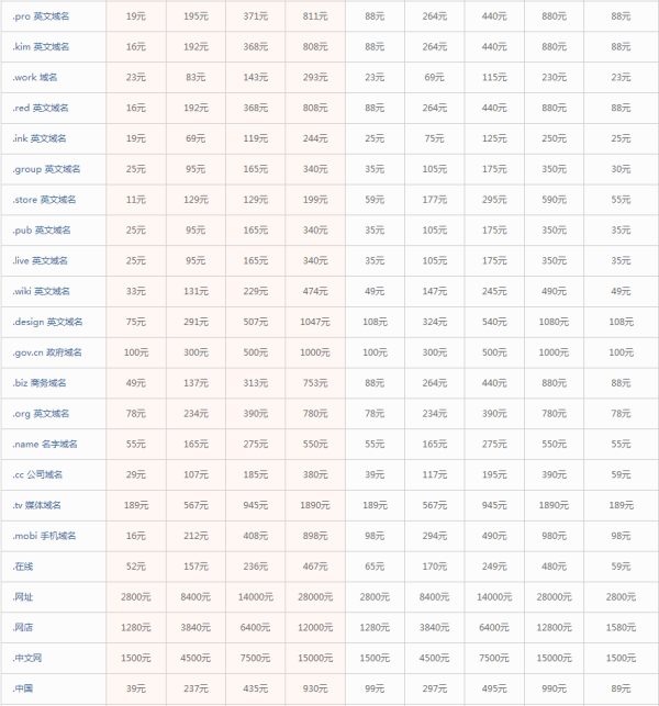 不同后缀的域名后缀的价格都不一样,这里的指的的普通的域名,还有一类具有特殊含义或段域名主要是用于交易,价格根据卖家出价来定,一般普通个人和企业注册没有注册过的普通就可以了,下面列出域名的价格表,供参考: