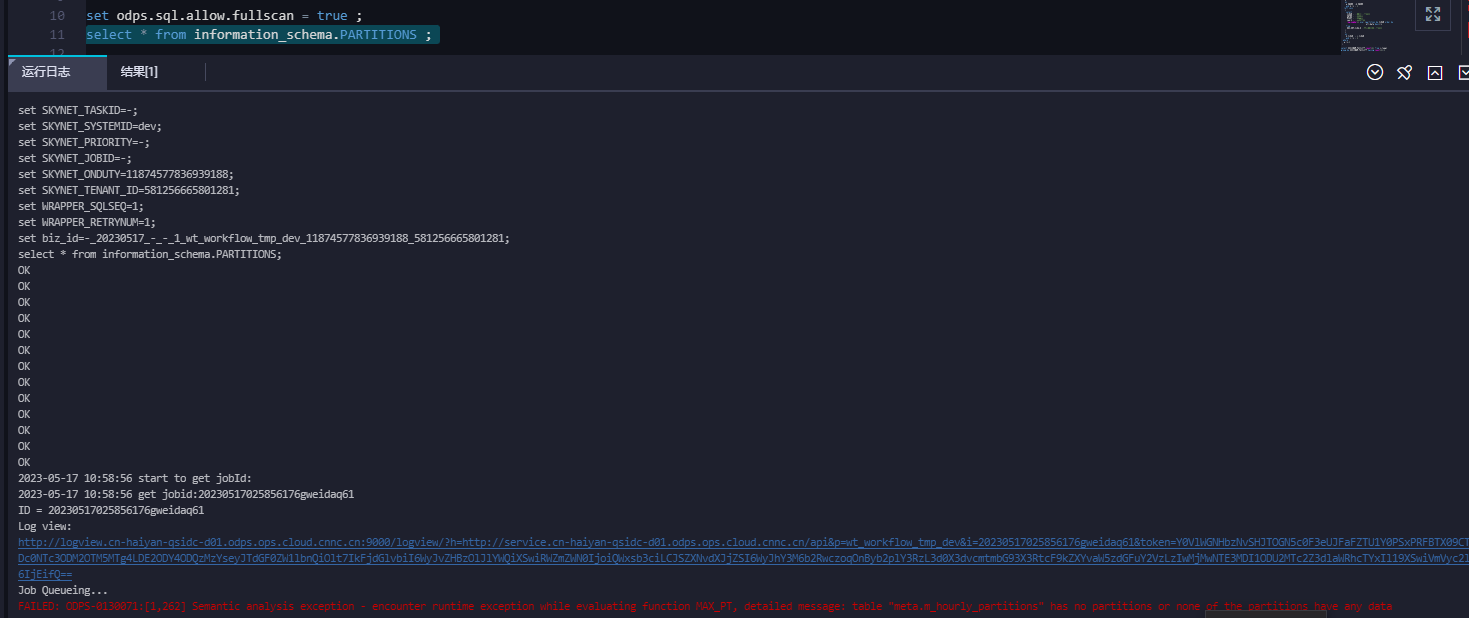 MaxCompute元数据查询,报错是什么情况?logview报错,打不开,界面上的报错内容是:FAILED: ODPS-0130071:[1,262] Semantic analysis exception - encounter runtime exception while evaluating function MAX_PT, detailed message: table "meta.m_hourly_partitions" has no partitions or none of the partitions have any data,