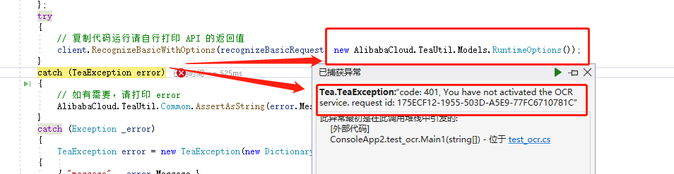 这个错误信息表明您在调用阿里云的OCR服务时遇到了401错误,原因是您没有激活OCR服务。要激活OCR服务,您需要在阿里云控制台上进行操作。首先,登录到阿里云控制台,然后在右上角的菜单中选择“服务”,在“服务”页面中找到“OCR”服务,点击“启用”按钮即可激活该服务。激活后,您就可以使用OCR服务进行文字识别操作了。