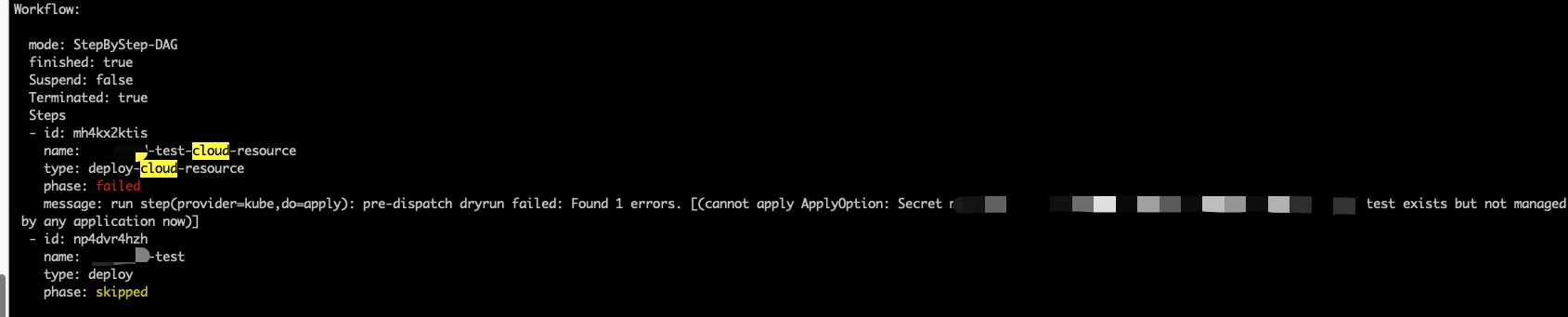 在OAM、KubeVela里面,使用workflow/deploy-cloud-resource的时候,必现一个apply的报错。apply ApplyOption: Secret test exists but not managed by any application now