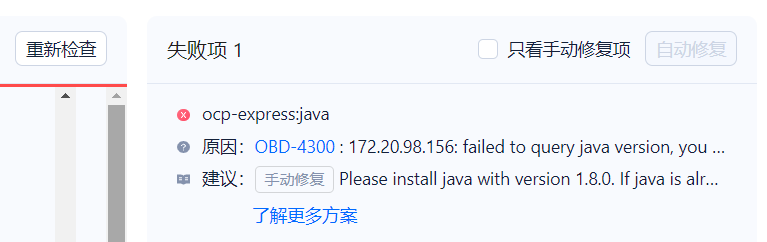 根据您的描述,出现了OBD-4300错误,错误提示为“172.20.98.156: failed to query java version, you ...”,建议为“Please install java with version 1.8.0. lf java is already installed, please manually check the environment settings”,并且出现了ocp-express和java相关的信息。