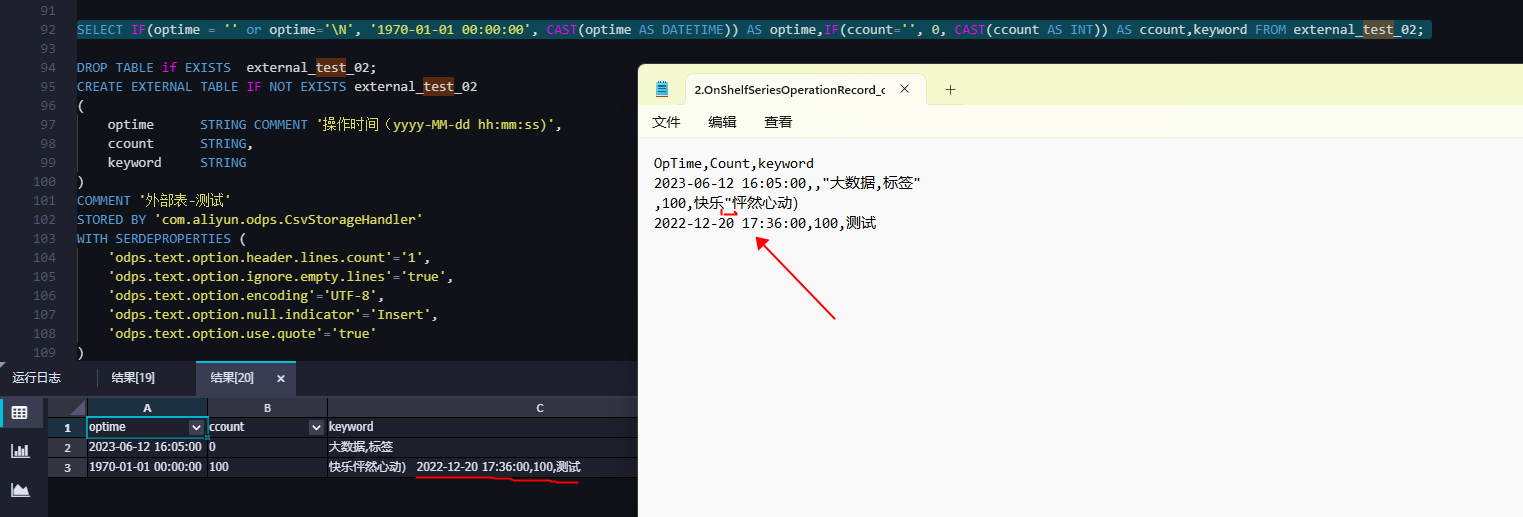 请问大数据计算MaxCompute csv文件中 部分行中存在带 一个双引号 的情况,就会出现图中的行分隔问题,怎么解决呢?