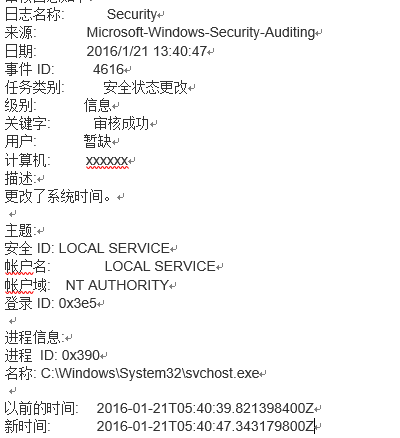 在时间跳变后,发现安全日志有如下ID 4616的审核日志,提示进程0x390修改的时间。
