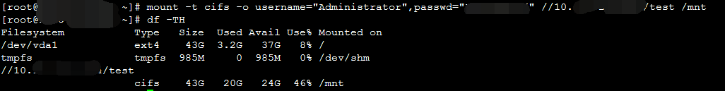 如果 mount 有异常的报错,核实是否有安装 cifs 组件。如果没有安装,则执行 yum install cifs-utils -y 进行安装然后重试。