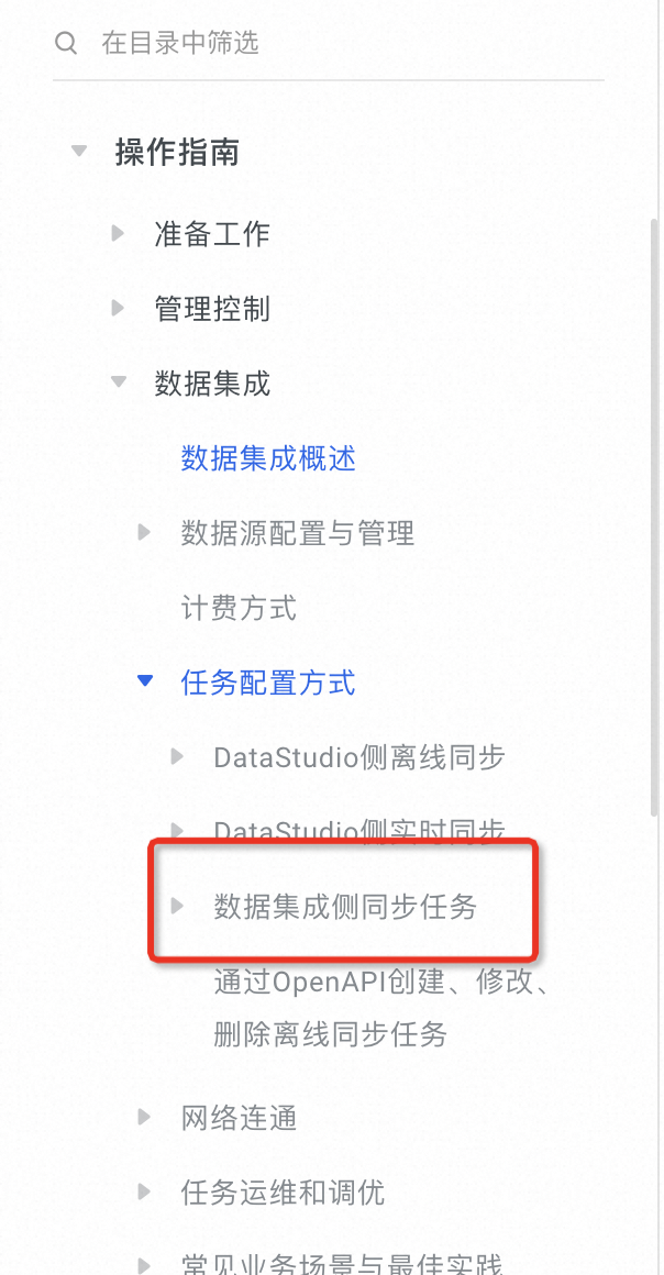 同步任务(数据集成):同步任务是用于将数据从一个数据源复制到另一个数据源的任务。它通常用于将源数据库中的数据同步到目标数据库中,以便进行数据分析、报表生成等操作。同步任务可以配置增量同步或全量同步,并支持字段映射、转换规则等高级设置。同步任务在 DataWorks 的数据集成模块中进行配置和管理。
