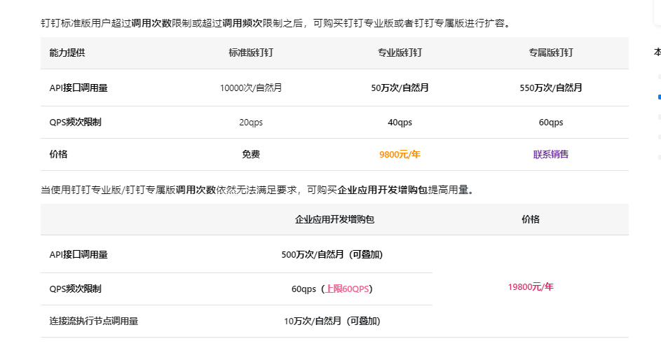 对标准版钉钉的组织,进行钉钉企业内部应用、委托第三方定制开发企业内部应用时使用的API调用量、应用QPS并发数和连接流执行节点次数进行调整。