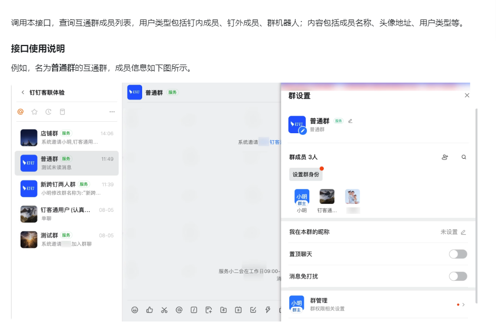 查询互通群成员列表,用户类型包括钉内成员、钉外成员、群机器人;内容包括成员名称、头像地址、用户类型等。