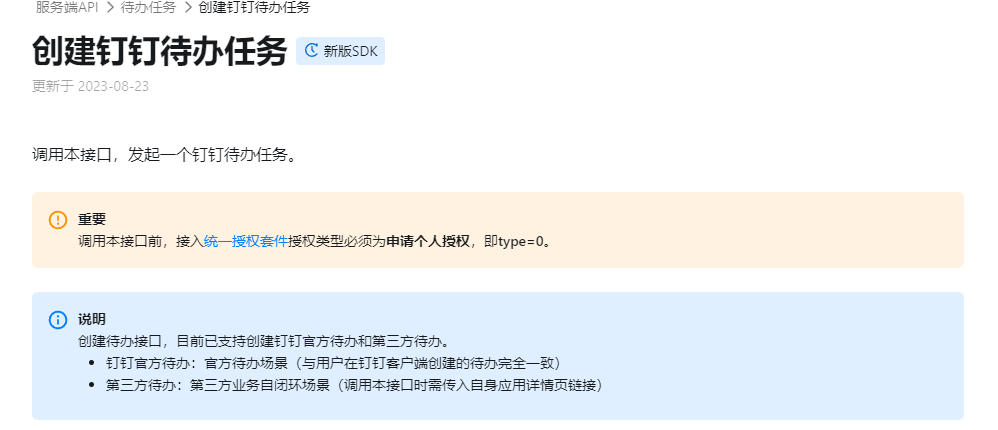 要调用「创建钉钉待办任务」接口,需要以下权限之一: 企业内部应用 支持 待办应用中待办写权限 第三方企业应用 支持 待办应用中待办写权限 第三方个人应用 暂不支持 待办应用中待办写权限 调用「创建钉钉待办任务」接口,实现发起一个钉钉待办任务。该待办事项会出现在钉钉客户端“待办事项”页面。 具体接口请求示例可以参考文本材料中的代码。