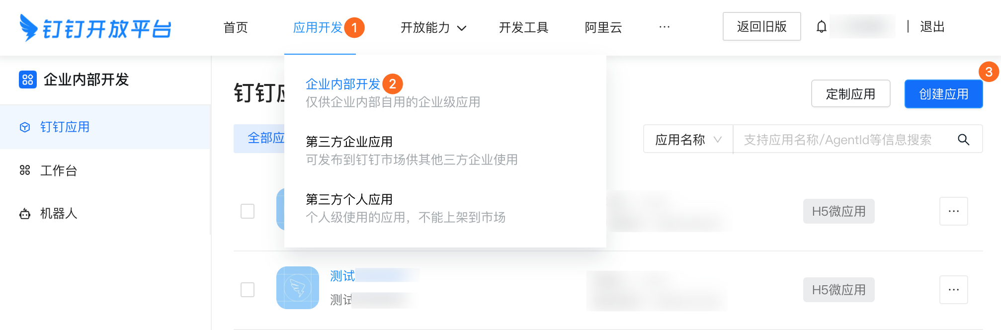 登录开发者后台,创建企业内部应用。
