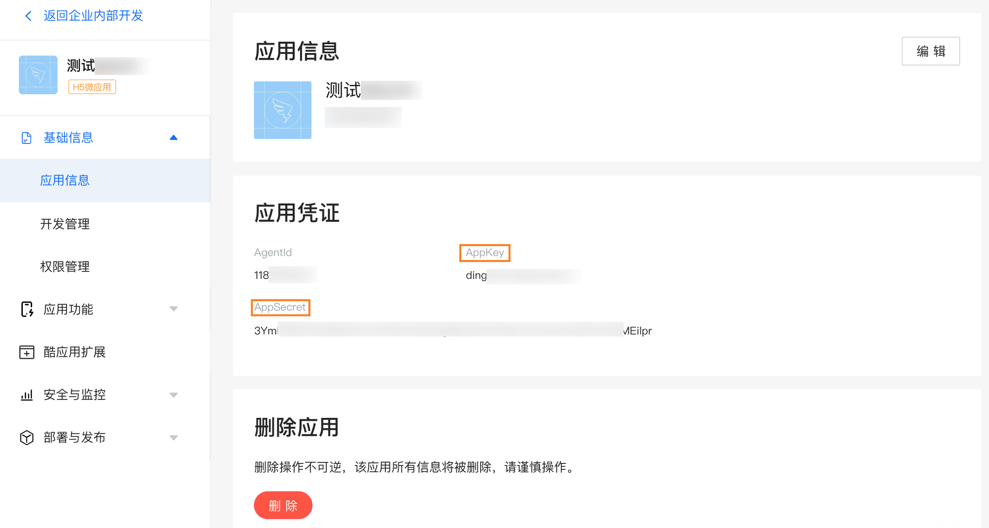 获取应用AppKey和AppSecret信息。