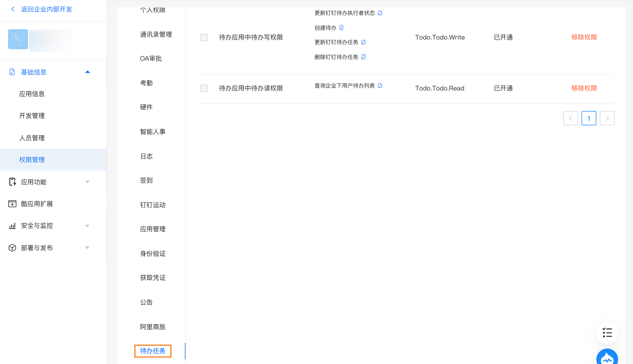 添加接口调用权限。查看“待办任务”,申请待办任务对应的权限。