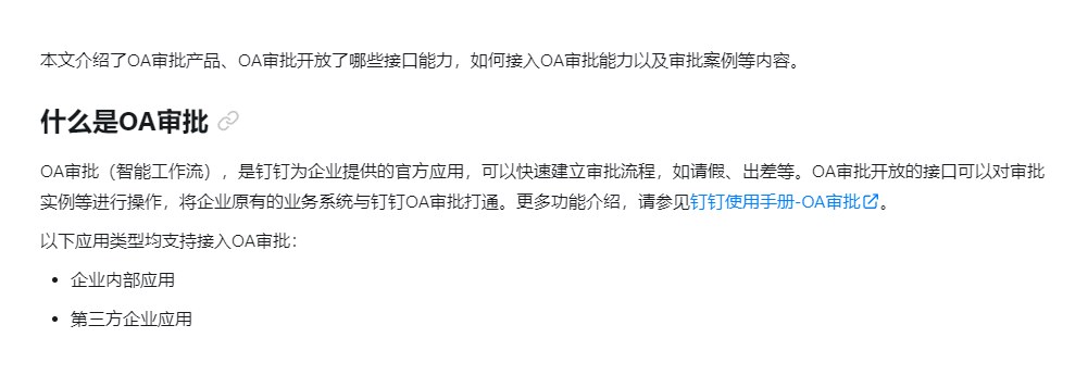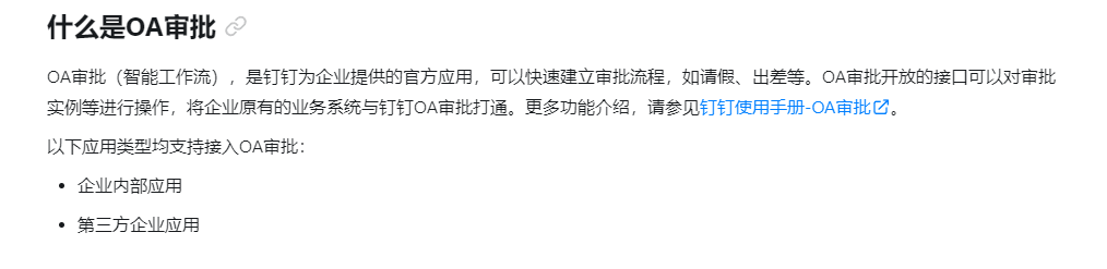 钉钉上的企业或组织可以基于钉钉的开放能力,自主开发供企业或组织内部使用,以满足办公场景中的个性化需求。该类应用无需钉钉团队审核,企业内部自行开发并使用即可。以下应用类型均支持接入OA审批:企业内部应用、第三方企业应用。OA审批开放的接口可以对审批实例等进行操作,将企业原有的业务系统与钉钉OA审批打通。企业可以参考客户案例来了解更多应用场景。钉钉的OA审批提供了丰富的接口开放能力,开发者可以通过API接口实现OA审批和企业业务系统打通。