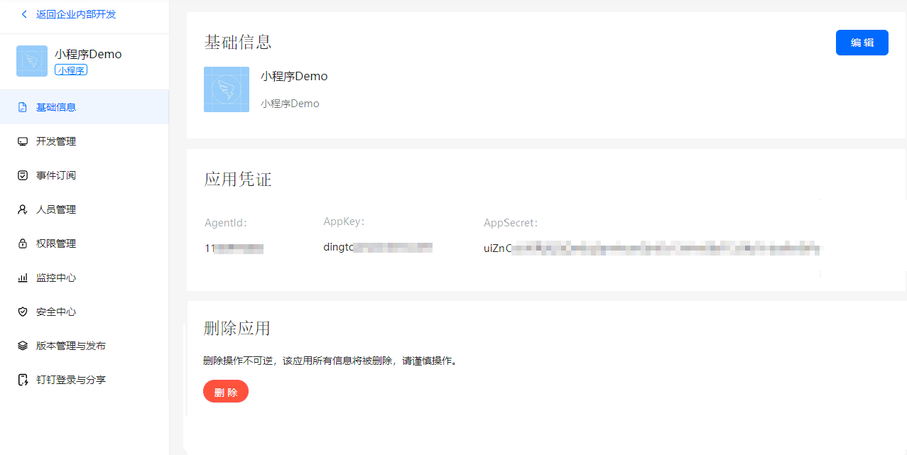 获取应用的AgentId和AppKey:创建成功后,获得一个AgentId和AppKey,作为与您的应用关联的唯一标识符。保存好这些信息,以便后续使用。