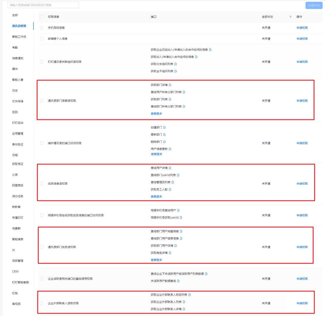 单击通讯录管理,选择通讯录相关接口权限,然后单击申请权限。
