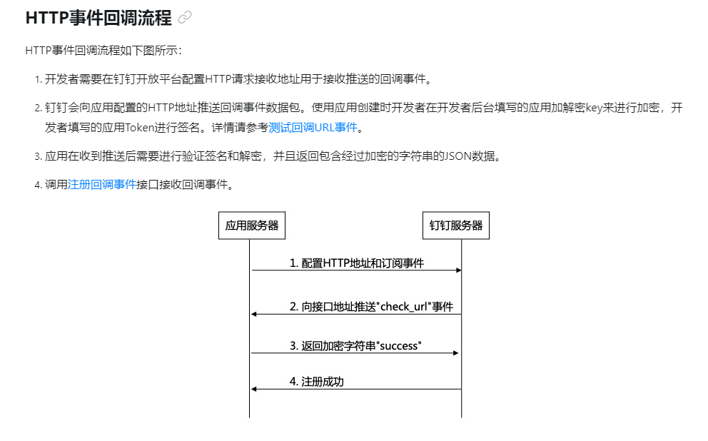 HTTP推送是使用回调地址推送数据的方式,开发者提供HTTP回调服务,钉钉服务器会向此回调地址推送数据,数据需要经过加解密的处理,了解更多。https://open.dingtalk.com/document/orgapp/callback-overview