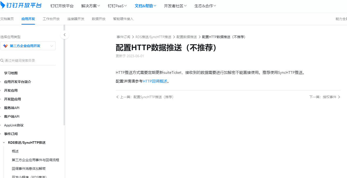 HTTP推送是使用回调地址推送数据的方式,开发者提供HTTP回调服务,钉钉服务器会向此回调地址推送数据,数据需要经过加解密的处理,您可以点击此处了解更多。SyncHttp推送SyncHTTP推送方式适用于本地部署的情况。与HTTP推送方式比,SyncHTTP推送的是业务数据的最终状态,开发者可以直接使用推送的数据。您可以点击此处查看。https://open.dingtalk.com/document/isvapp/configure-http-push