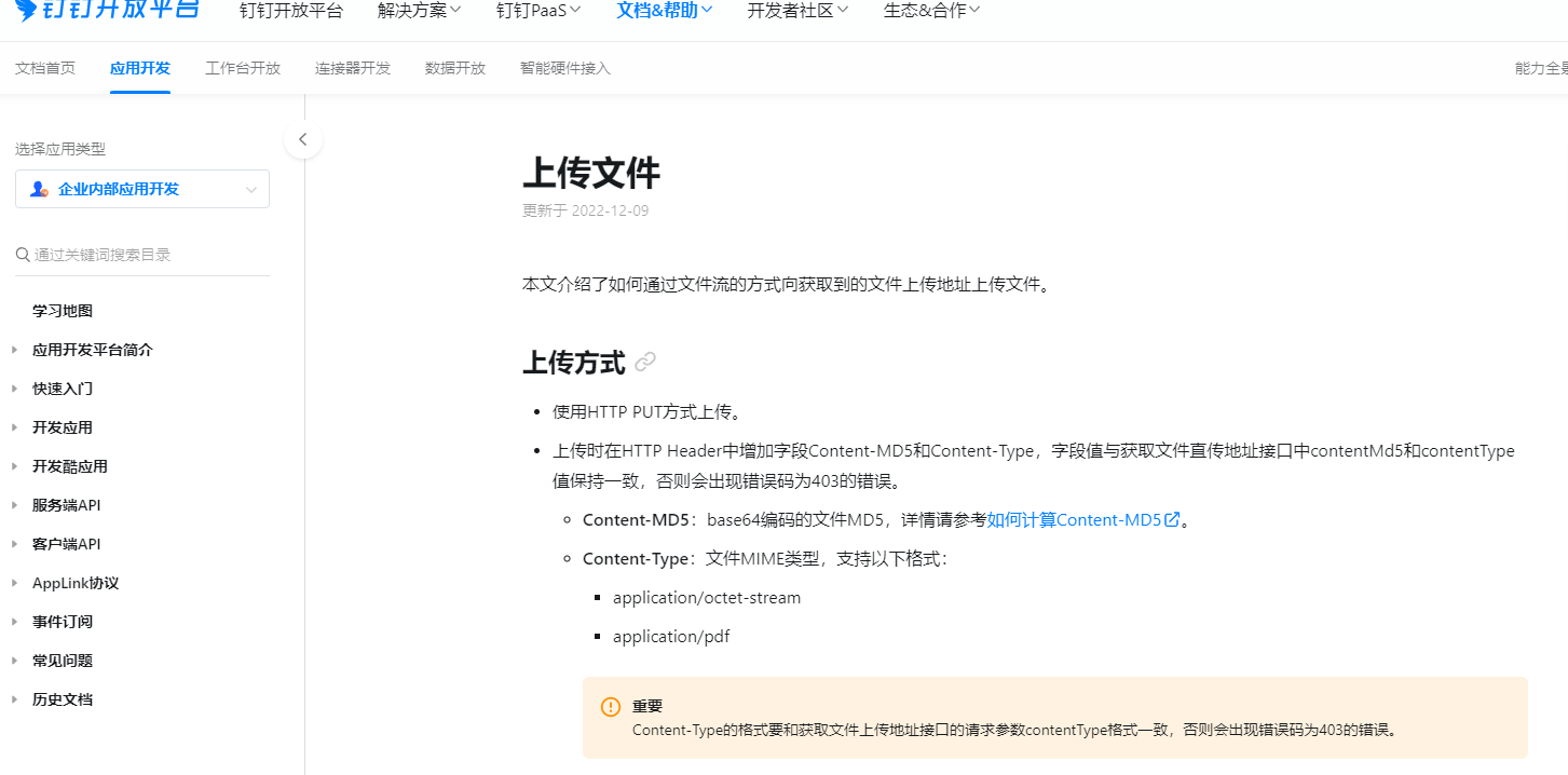 上传时在HTTP Header中增加字段Content-MD5和Content-Type,字段值与获取文件直传地址接口中contentMd5和contentType值保持一致,否则会出现错误码为403的错误。
