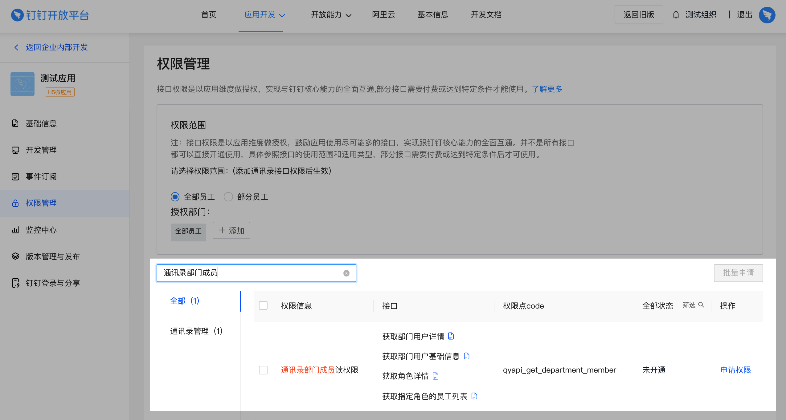 步骤四:添加接口调用权限。搜索通讯录权限,并点击申请。