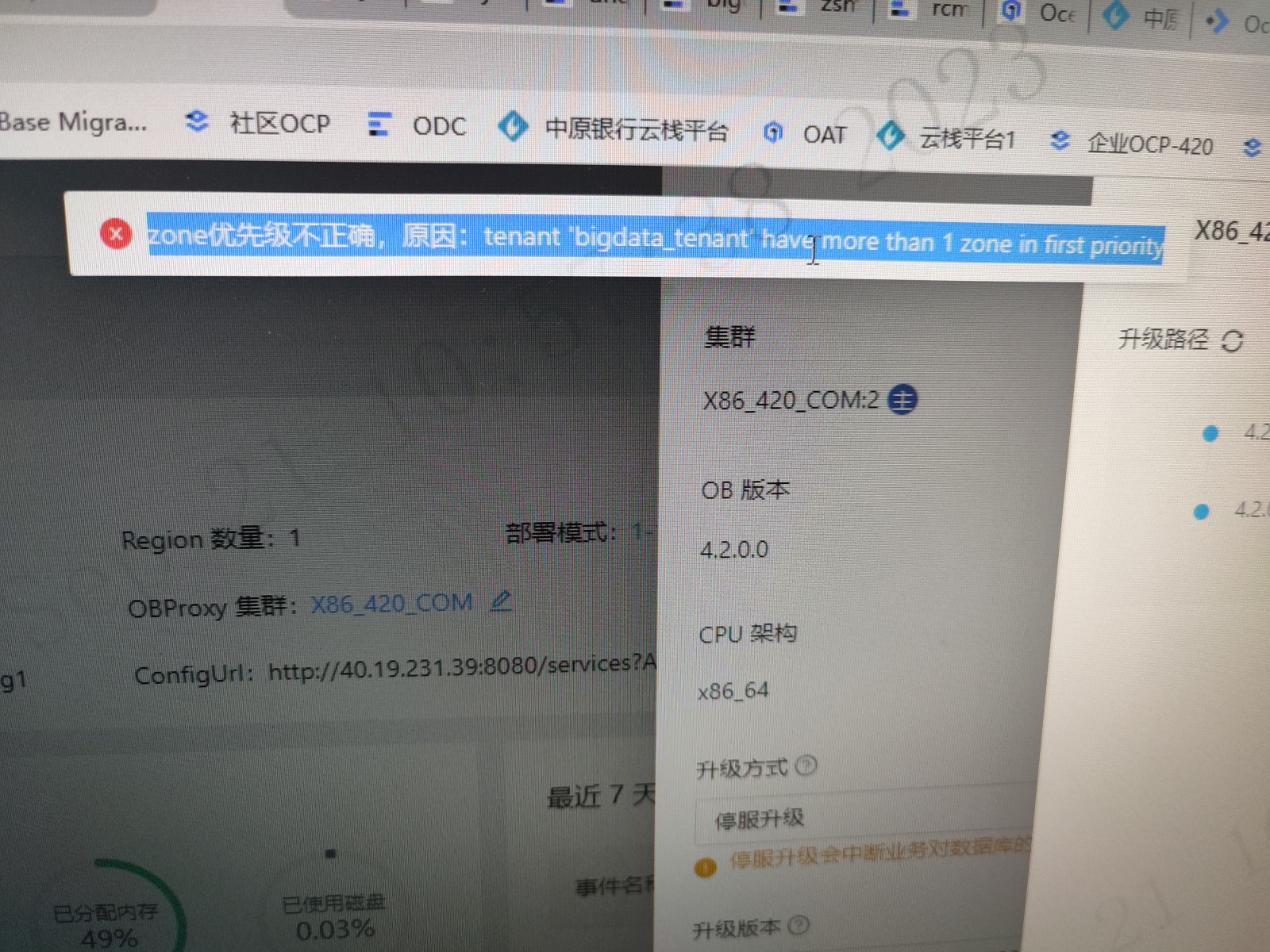 "对比一下SYS租户的优先级。再看下其他的优先级。sys是zone1;zone2;zone3 其他的是zone1,zone2,.... 符号,换成;。升级必须把租户的优先级改为 顺序优先级 zone1;zone2;zone3 这种。