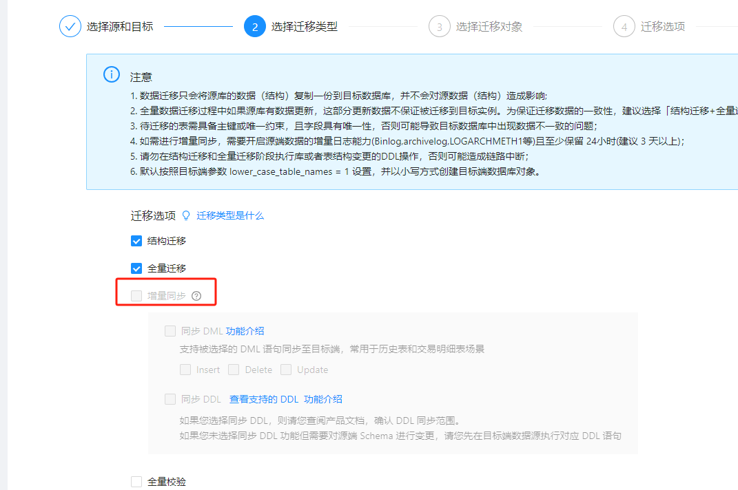全量迁移和增量同步不能同时选择。如需进行增量同步,需要开启源端数据的增量日志能力(Binlog,archivelog,LOGARCHMETH等)且至少保留 24小时建议 3 天以上):