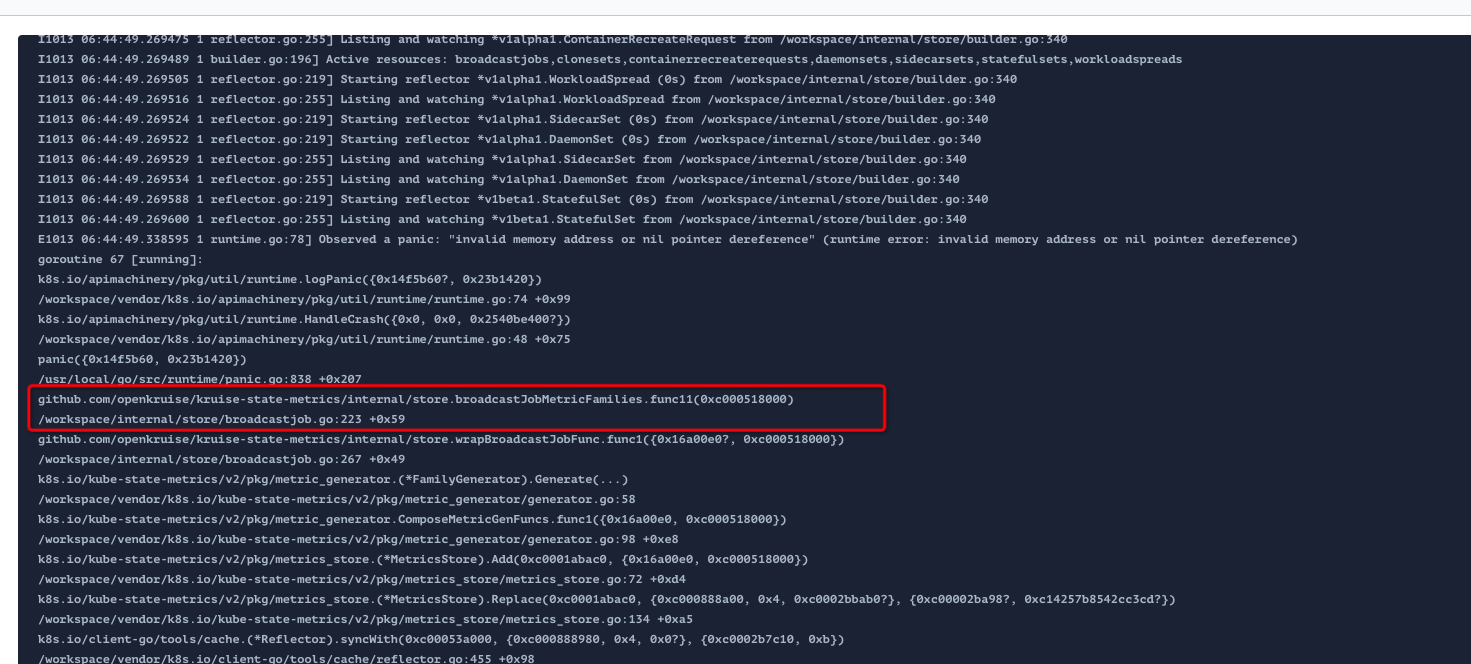 从您提供的图片中,我们可以看到在kruise-state-metrics的代码中存在一个空指针异常。为了解决这个问题,我们需要查看具体的代码实现并找到相应的问题。