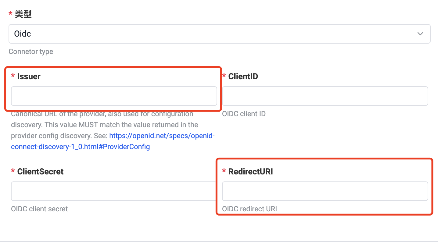 "KubeVela中接 dex 单点登录,使用的 oidc 协议,这两个参数怎么填呢?