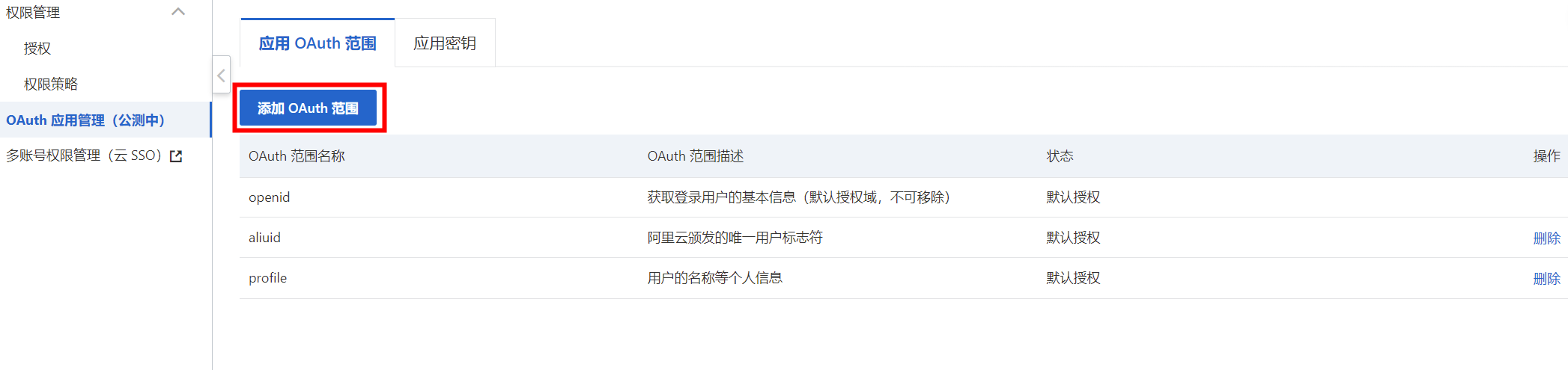 点击添加OAuth范围,选择openid、aliuid、profile,此3项为必选项,可以按照需求多选其他项。