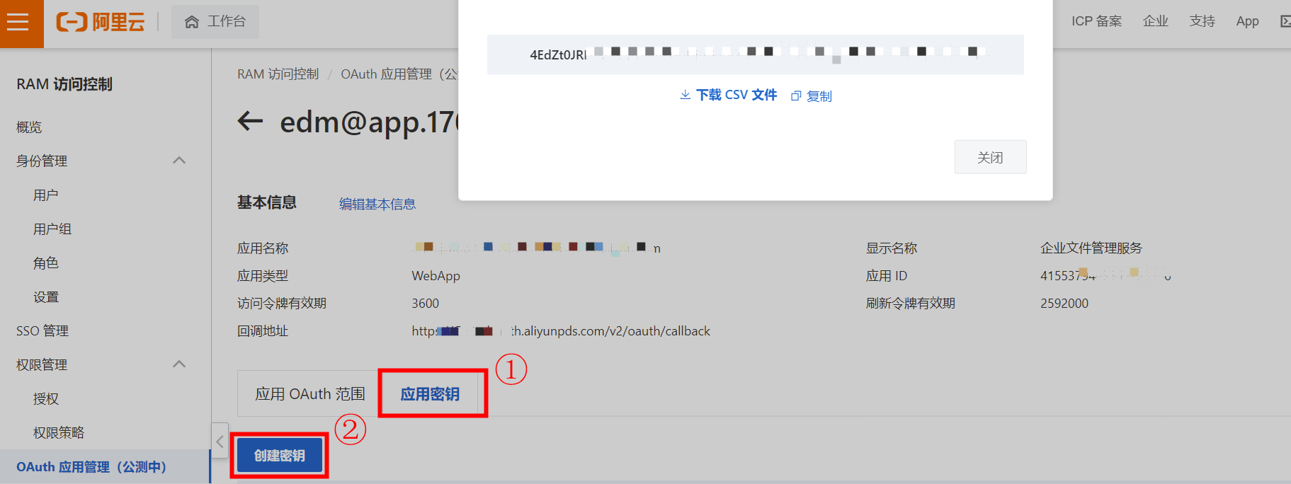 点击应用密钥,进行创建密钥,将弹出您的密钥信息,请复制保存。
