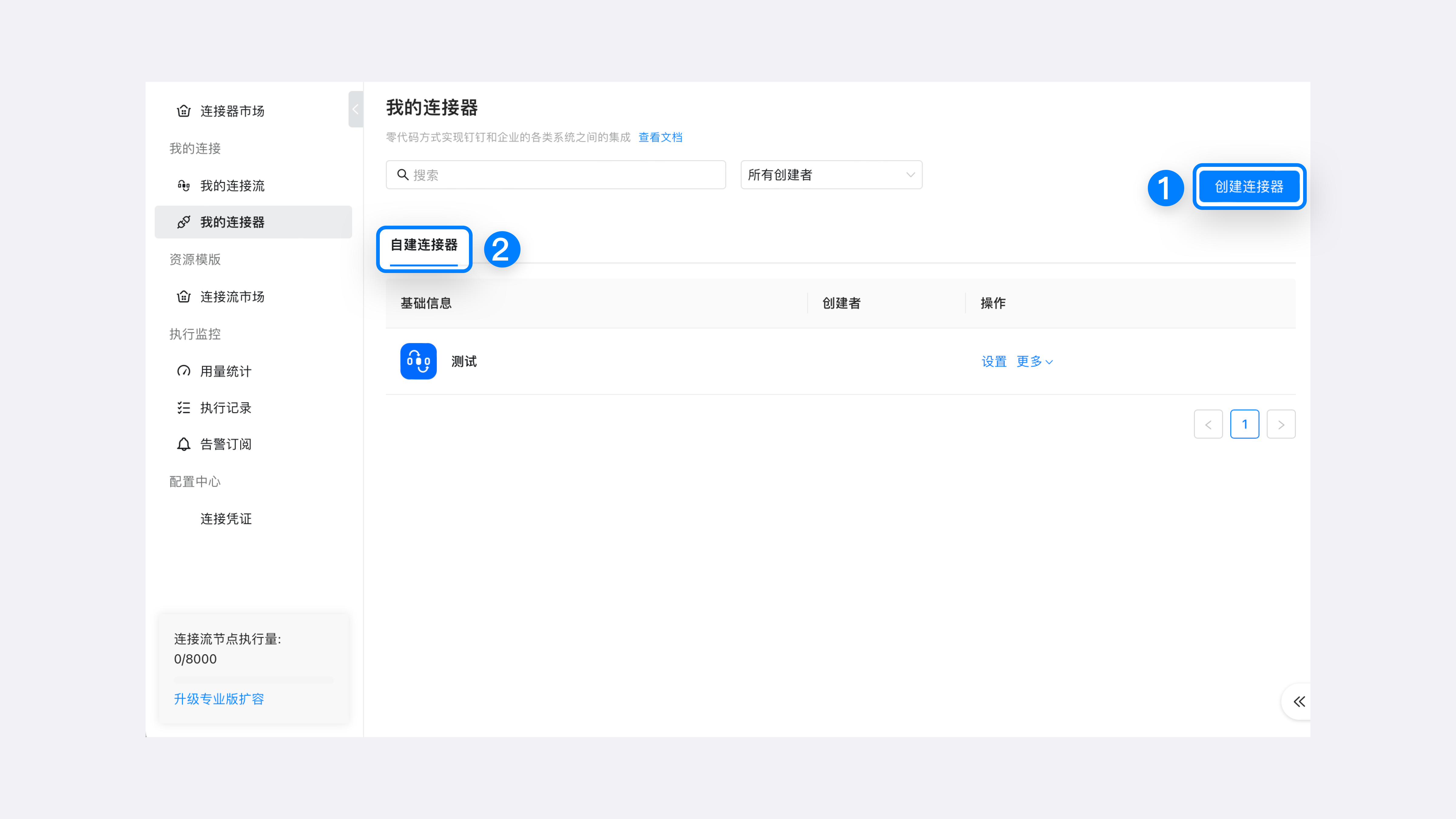 以下为连接器主页,主要分为创建连接器(图示中①)和自建连接器主页(图示中②)如下图所示: