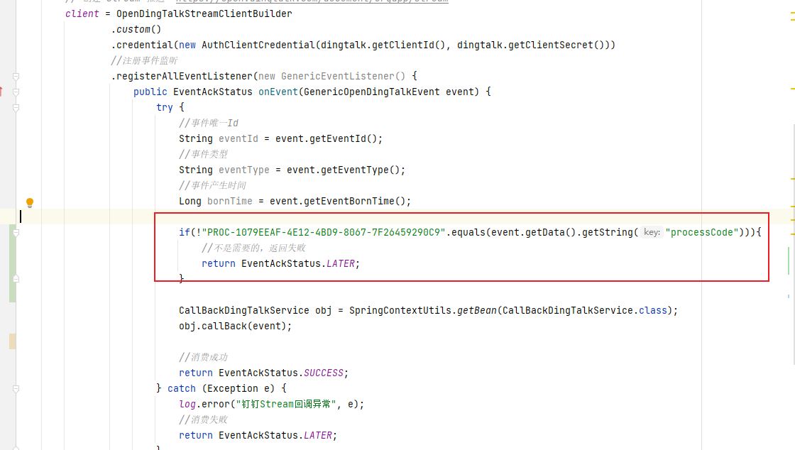 这段代码的作用是判断事件数据中是否存在一个名为"processCode"的键,其值为"PROC-1079FFAF-4E12-4BD9-8067-7F2645929C9"。如果存在,那么返回EventAckStatus.LATER。