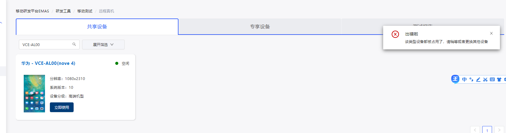 应用研发平台EMAS中这个远程真机状态显示 空闲 但是使用的时候又报错 ,请问为什么?
