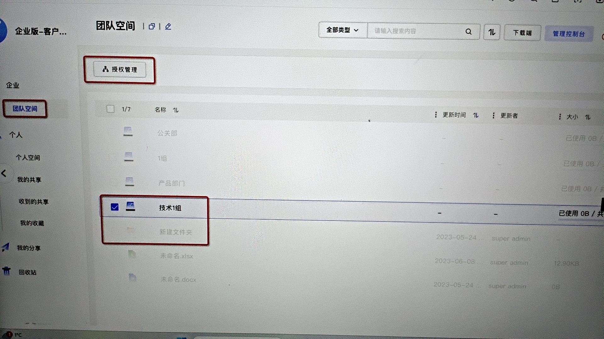 2.点击页面右上角按钮,返回用户页面,在团队空间中,单选文件夹/团队盘-勾选框-授权管理。(若没有授权管理选项,Web端刷新一下页面即可,PC端需要重新登录。)
