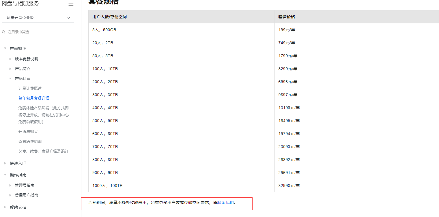 活动期间,流量不额外收取费用;如有更多用户数或存储空间需求,请联系我们。https://help.aliyun.com/zh/pds/drive-and-photo-service-ent/product-overview/contact-technical-support-for-drive-and-photo-service-enterprise-edition