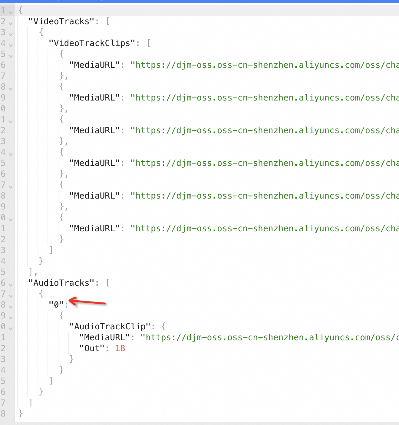 AudioTracks 的 json 的组织形式不太对,VideoTracks 是没问题的,请参照 VideoTracks 进行修改